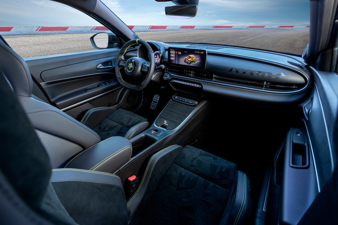 mid Groß-Gerau - Das mit Abarth-Grafiken verzierte Armaturenbrett und exklusive Muster der Sitzbezüge werden ergänzt durch das Skorpion-Logo auf dem Lenkrad. Abarth / Stellantis