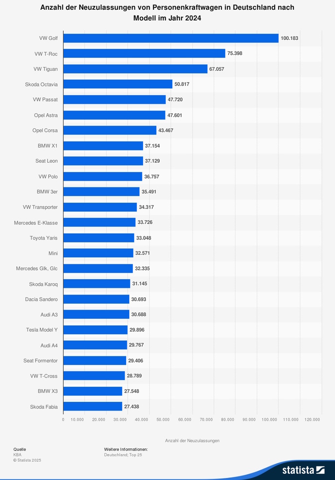 Die beliebtesten Autos 2024 - VW dominiert die Top Ten