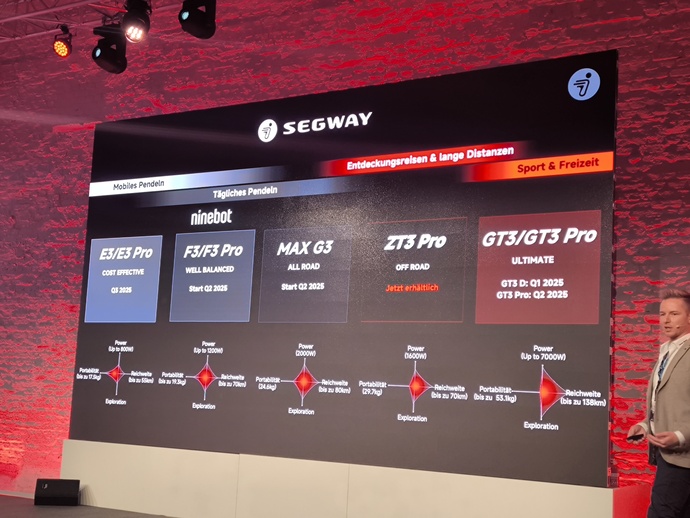 Fünf neue E-Kickscooter-Baureihen hat Segway-Ninebot Anfang 2025 in Köln vorgestellt. Alle fünf werden in diesem Jahr in Deutschland neu auf den Markt kommen Foto: SP-X/Mario Hommen
