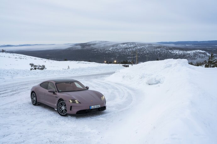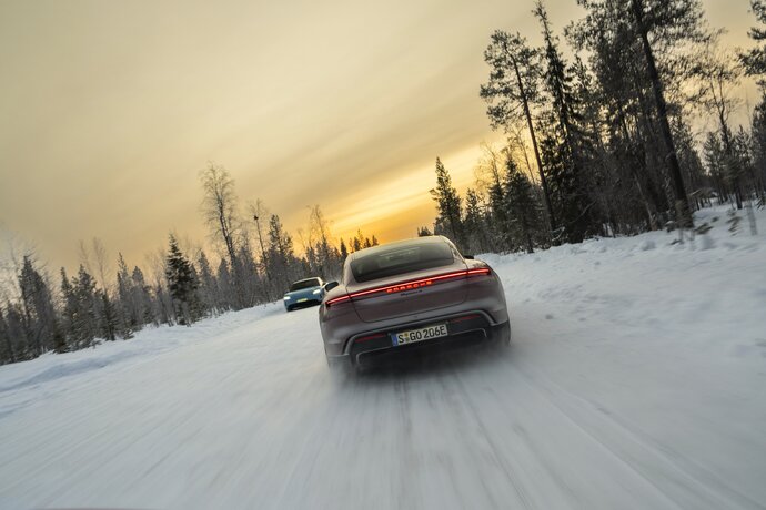 Auf schneebedeckten Straßen beschleunigt der Taycan trotz mitteleuropäischer Winterreifen auch in Lappland souverän Foto: Porsche