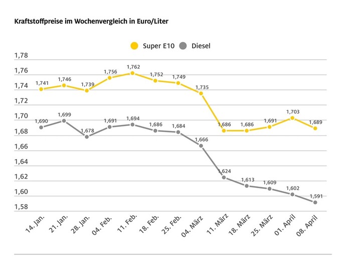 Die Entwicklung der Kraftstoffpreise in den vergangenen Wochen. Photo: ADAC via Autoren-Union Mobilität