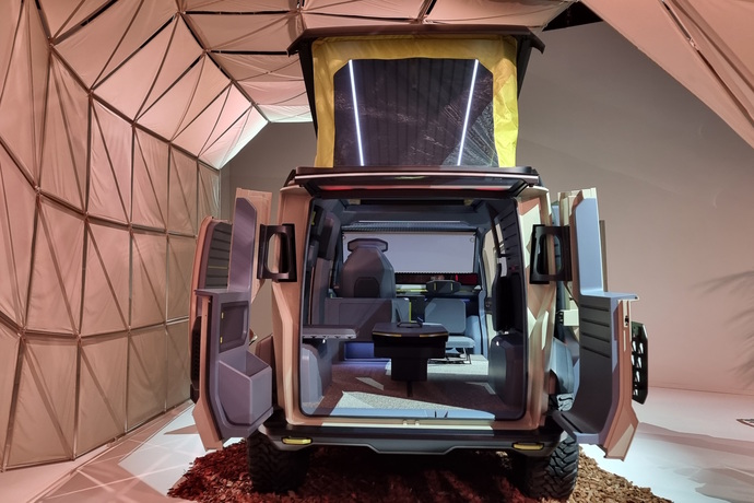 Auf der weltgrößten Messe für Design im schicken Mailand zeigt Kia unter anderem eine Campingversion des Elektro-Transporters PV5 Foto: SP-X/Peter Weißenberg