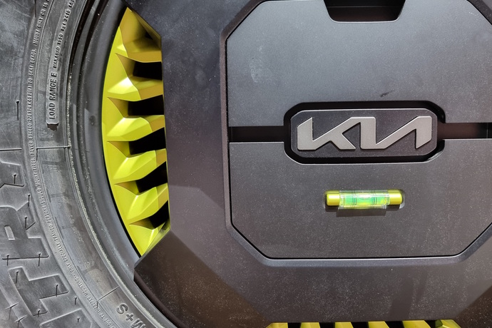 Kia PV5 WKNDR mit Wasserwaage in den Felgen zum ebenen Parken Foto: SP-X/Peter Weißenberg
