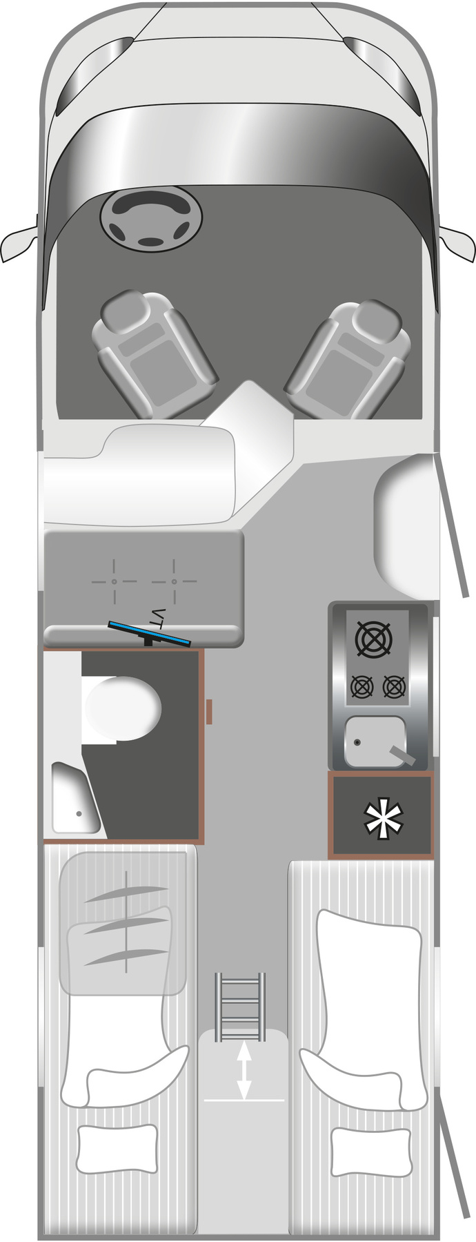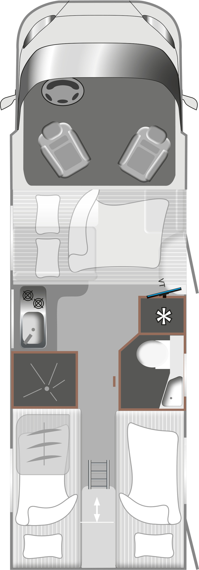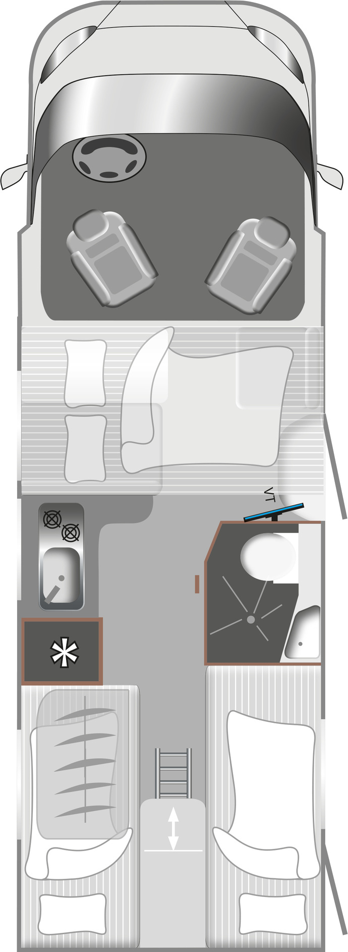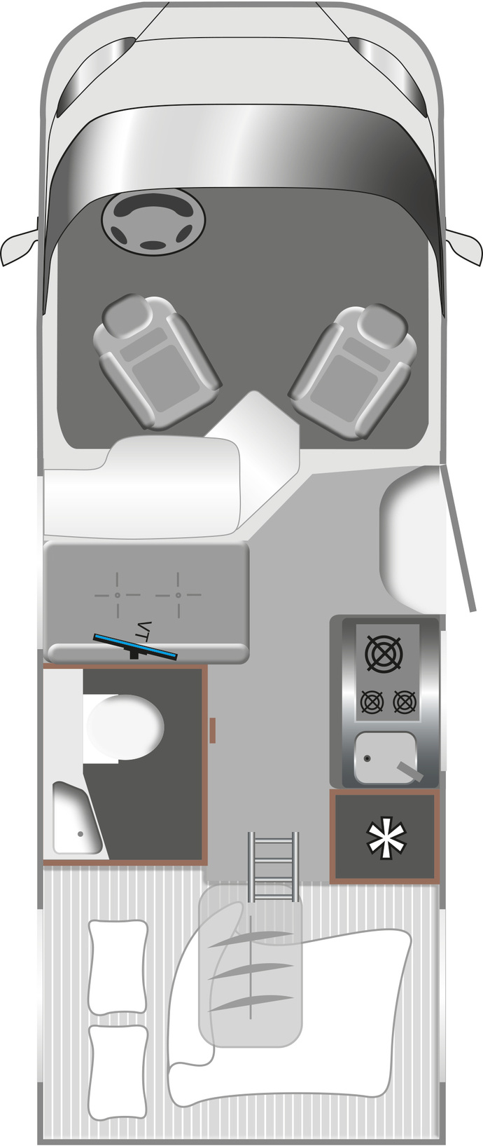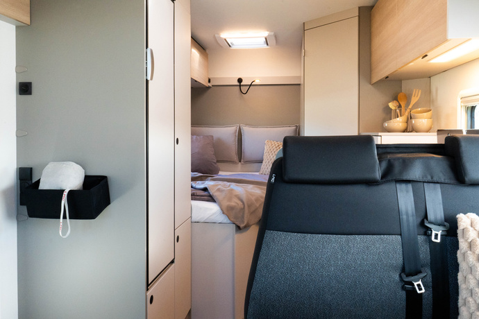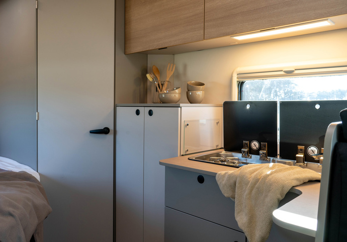 Der vordere Bereich lässt sich dank drehbarer Vordersitze zur 4-Personen-Sitzgruppe umgestalten. Dahinter befindet sich die Küche Foto: LMC