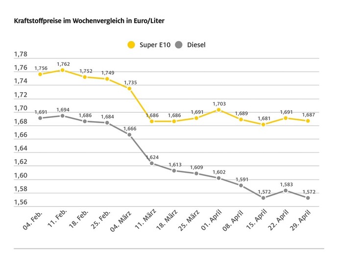 Die Entwicklung der Kraftstoffpreise in den vergangenen Wochen. Photo: ADAC via Autoren-Union Mobilität