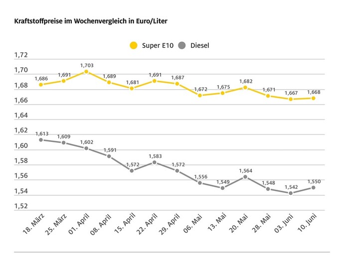 Die Entwicklung der Kraftstoffpreise in den vergangenen Wochen. Photo: ADAC via Autoren-Union Mobilität