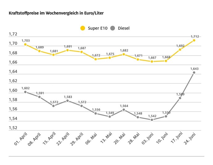 Die Entwicklung der Kraftstoffpreise in den vergangenen Wochen. Photo: ADAC via Autoren-Union Mobilität