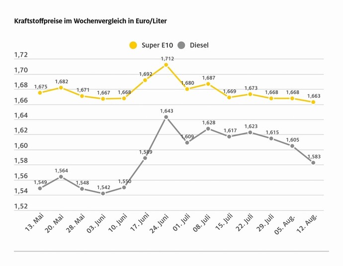 Die Entwicklung der Kraftstoffpreise in den vergangenen Wochen. Photo: ADAC via Autoren-Union Mobilität