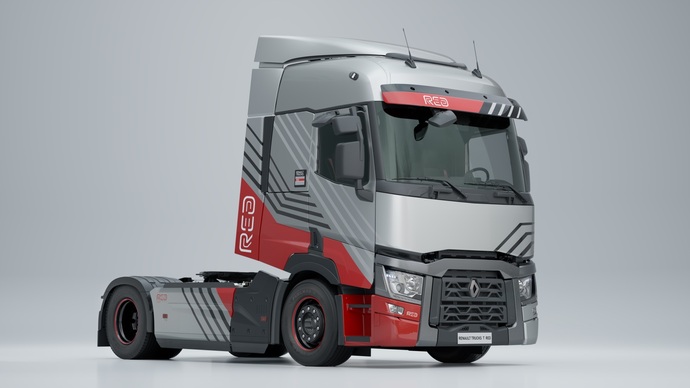 Grautöne sowie den für Renault Trucks typischen roten Farbton auf. Dynamische grafische Linien an den Fahrzeugseiten sollen für das neue Logo von Renault Trucks stehen.