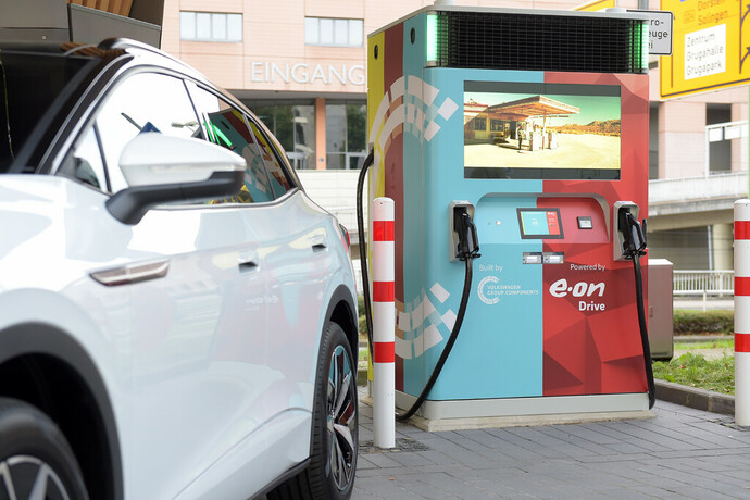 Für kleinere Ladeparks oder einzelne Ladestationen eignet sich der vom Energieunternehmen und Volkswagen gemeinsam entwickelte Eon Drive Booster, der zwei Fahrzeuge gleichzeitig mit einer Ladeleistung von jeweils bis zu 150 kW laden kann. Die Speicherbatterie mit einer Leistung von 193,5 kWh stammt von Volkswagen. Die Anlage benötigt lediglich einen Stromanschluss mit mindestens 16 Ampere.