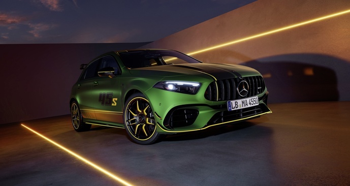 Besonders auffällig ist die Lackierung in "AMG green hell magno". Dieser Farbton war bislang für die Kompaktklasse nicht erhältlich. Hinzu kommt die Folierung mit einem großen "45 S"-Schriftzug auf den Türen sowie dem AMG Wappen auf der Motorhaube. Die "Limited Edition" rollt auf ihnen vorbehaltenen mattschwarzen 19-Zoll AMG Schmiederädern im Sieben-Doppelspeichen-Design vor.