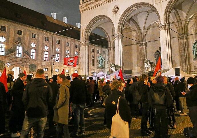 Auf dem Odeonsplatz waren Plakate mit Sprüchen wie "Söder, du pietätsloses Arschloch" oder "AfD Rassist:innen Pack" und Antifa-Fahnen zu sehen.