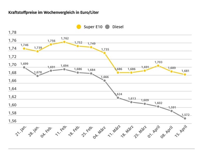 Der Abwärtstrend der Spritpreise setzt sich zwar fort, nach Ansicht des ADAC jedoch immer noch nicht weit genug: Wie die aktuelle Auswertung des Automobilclubs zeigt, ist der Literpreis von Super E10 binnen Wochenfrist um 0,8 Cent gesunken und liegt nun im bundesweiten Mittel bei 1,681 Euro. Diesel ist 1,9 Cent günstiger als in der Vorwoche und kostet aktuell im Schnitt 1,572 Euro.