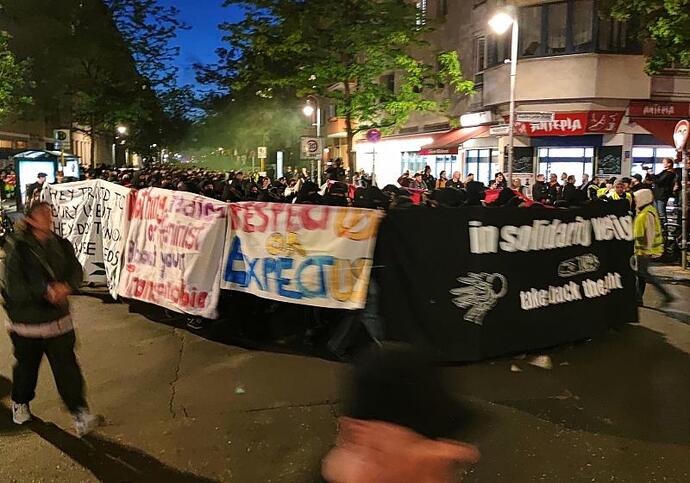 Berlin (dts Nachrichtenagentur) - Das Spektakel zum 1. Mai in Berlin hat am Mittwochabend mit einer "Queerfeminismus-Demo" in Kreuzberg begonnen. Schätzungen von dts-Reportern zufolge zogen mindestens zweitausend überwiegend junge Frauen durch die Straßen des früheren Postzustellbezirks SO 36. Auf Plakaten waren unter anderem Parolen wie "Patriarchat in Flammen" oder "Take back the night" zu lesen, viele Demonstrantinnen richten sich auch gegen das Vorgehen Israels im Gazastreifen.