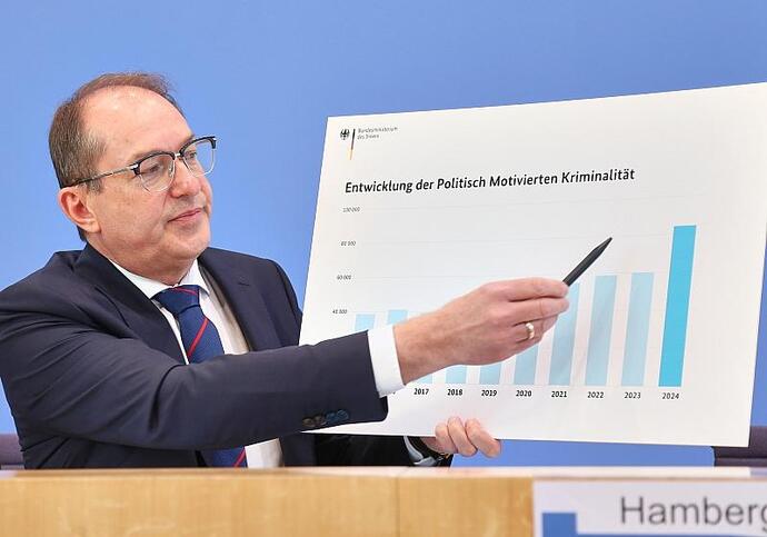 Die Zahl der politisch motivierten Gewalttaten ist ebenfalls um 15,33 Prozent auf 4.107 Delikte angestiegen. "Der noch nie dagewesene Anstieg der Fallzahlen politisch motivierter Straftaten ist eine bedenkliche Entwicklung, die wir mit aller Konsequenz und Entschlossenheit bekämpfen", sagte Bundesinnenminister Alexander Dobrindt (CSU). "Insbesondere die hohe Zahl antisemitischer Straftaten ist nicht hinnehmbar."