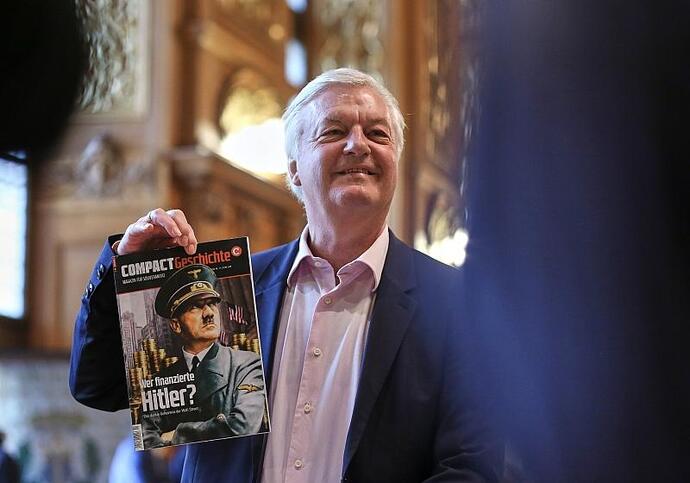 Chefredakteur Jürgen Elsässer hielt am Dienstag zum Prozessauftakt unter anderem eine Ausgabe des Magazins mit dem Konterfei von Adolf Hitler und der Titelzeile "Wer finanzierte Hitler" in die Kameras. Auch danach sparte er nicht mit offensichtlich ironisch gemeinten Provokationen: "In meiner Ehe hat meine Frau die Hosen an. Aber in der Redaktion, im Verlag bin ich der Diktator", sagte er vor Gericht.