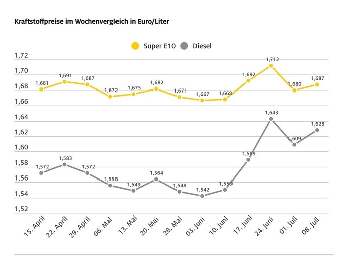 Vor allem der spürbare Anstieg des Rohölpreises und der etwas schwächere Euro hat in den vergangenen sieben Tagen zu deutlich höheren Kraftstoffpreisen geführt. Der ADAC meldet für den Liter Super E10 im Schnitt aktuell 1,687 Euro pro Liter. Das sind 0,7 Cent mehr als vor einer Woche. Der Dieselpreis legte um 1,9 Cent auf im Mittel 1,628 Euro zu.
