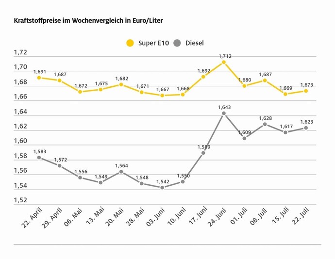 Obwohl der Preis für Rohöl nahezu auf dem Niveau der Vorwoche steht, sind die Kraftstoffpreise leicht gestiegen. Das ergibt die aktuelle Auswertung der Kraftstoffpreise in Deutschland durch den ADAC. So kostet derzeit im bundesweiten Durchschnitt ein Liter Super E10 1,673 Euro, ein Plus gegenüber der vergangenen Woche um 0,4 Cent. Diesel hat sich um 0,6 Cent je Liter verteuert und kostet 1,623 Euro je Liter.