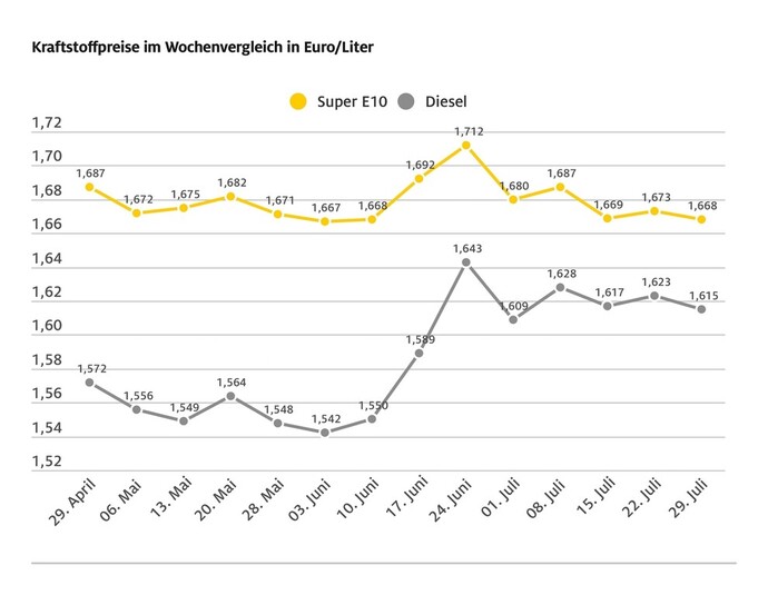 Gegenüber der vergangenen Woche ist Kraftstoff in Deutschland wieder etwas günstiger geworden – obwohl der Rohölpreis gestiegen ist und der Euro etwas schwächer notiert. Laut ADAC kostet ein Liter Super E10 im bundesweiten Durchschnitt aktuell 1,668 Euro. Das ist ein halber Cent weniger als in der Vorwoche. Diesel verbilligte sich um 0,8 Cent auf im Mittel 1,615 Euro pro Liter.