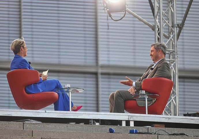 Außenpolitisch gibt Markus Söder der Regierung und Bundeskanzler Friedrich Merz eine "Eins mit Stern" für das, was Merz geleistet habe, gerade im Vergleich zu seinem Vorgänger. Angesprochen auf Merz` gestrige Aussage auf dem CDU-Parteitag in Niedersachsen, dass er nicht zufrieden sei, was die Regierung bisher geschafft habe, vergleicht Söder die bisherige Arbeit der ersten Monate mit einem Fußballspiel: "Wir haben sehr gut losgelegt und haben am Schluss mit der Stromsteuer beginnend und mit der Richterwahl ein paar blöde Tore kassiert, die die Stimmung natürlich verunsichert haben."